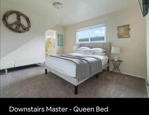 Downstairs master has a queen sized bed, tv, chaise lounge and adjoining bath.